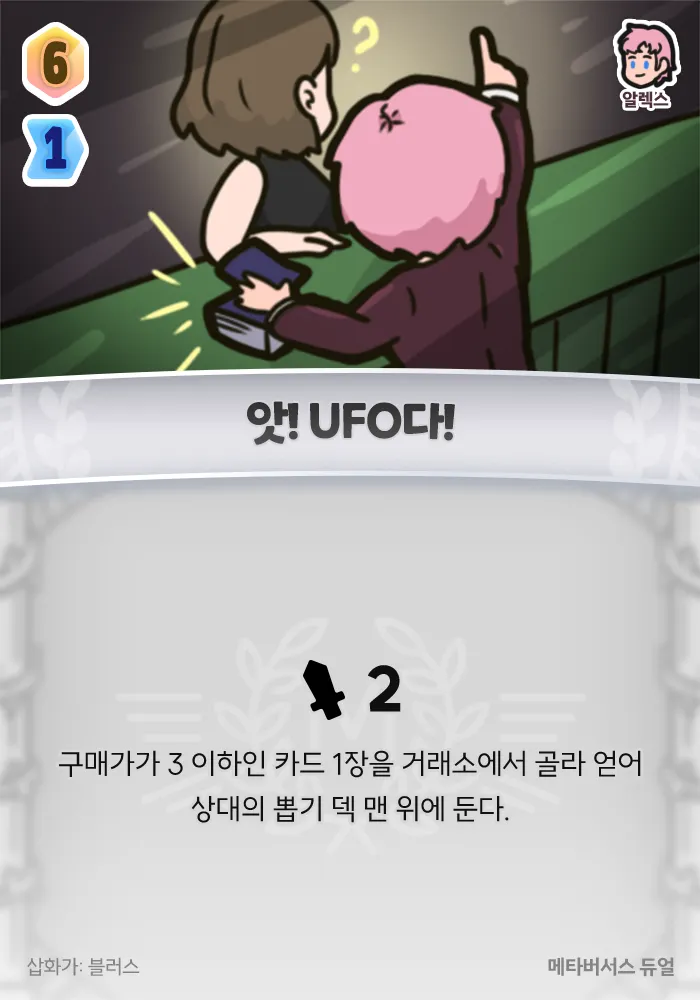 2 피해, 구매가가 3 이하인 카드 1장을 거래소에서 골라 얻어 상대의 뽑기 덱 맨 위에 둔다.