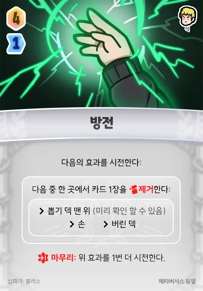 한다: ■ 뽑기 덱 맨 위 (미리 확인 할 수 있음) ■ 손 ■ 버린 덱 ]