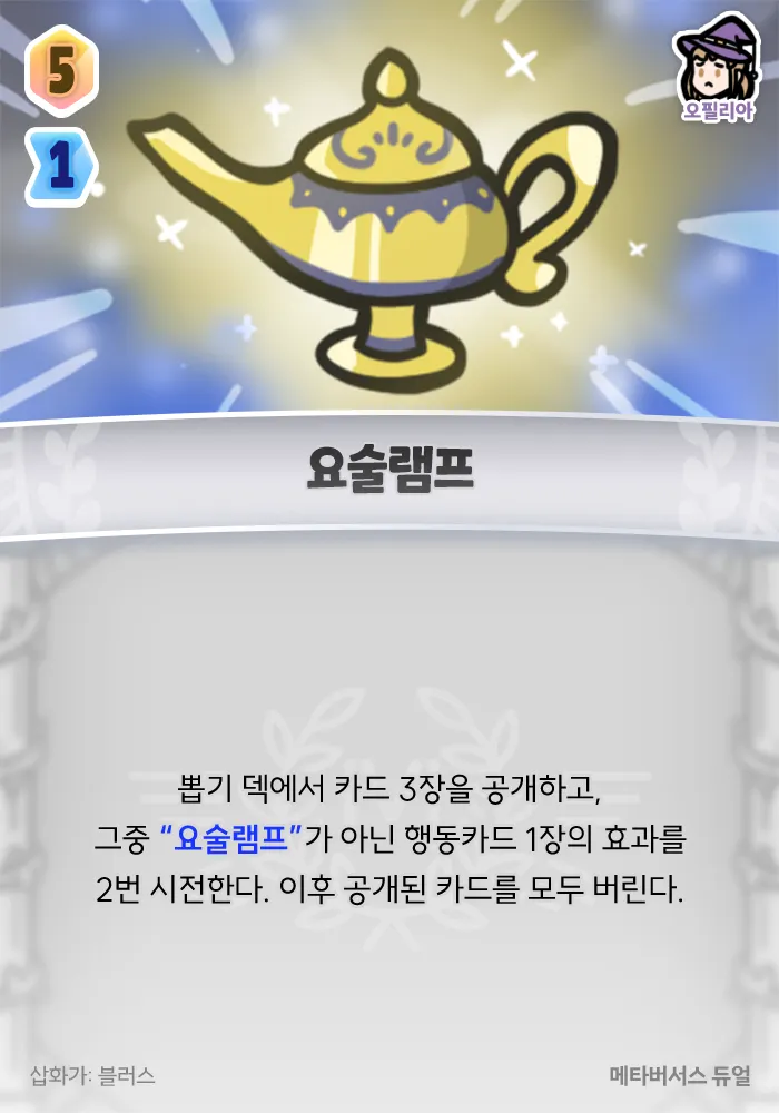 뽑기 덱에서 카드 3장을 공개하고, 그중 “요술램프”가 아닌 행동카드 1장의 효과를 2번 시전한다. 이후 공개된 카드를 모두 버린다.
