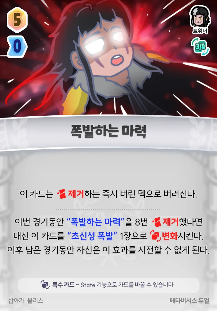 하는 즉시 버린 덱으로 버려진다. 이번 경기동안 자신이 “폭발하는 마력”을 8번