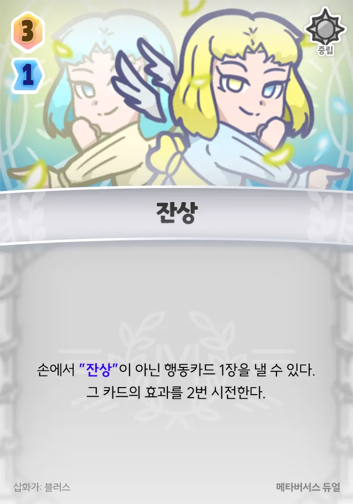 손에서 “잔상”이 아닌 행동카드 1장을 낼 수 있다. 그 카드의 효과를 2번 시전한다.
