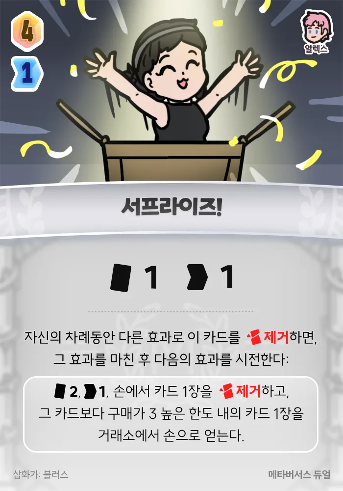 하고, 그 카드보다 구매가 3 높은 한도 내의 카드 1장을 거래소에서 손으로 얻는다. ]