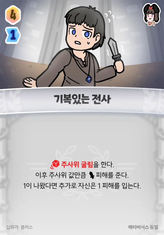 을 한다. 이후 주사위 값만큼 피해를 준다. 1이 나왔다면 추가로 자신은 1 피해를 입는다.