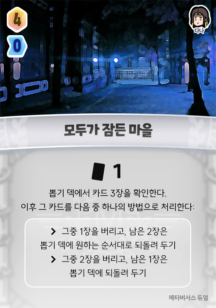 +1 카드, 뽑기 덱에서 카드 3장을 확인한다. 이후 그 카드를 다음 중 하나의 방법으로 처리한다: ■ 그중 1장을 버리고, 남은 2장은 뽑기 덱에 원하는 순서대로 되돌려 두기 ■ 그중 2장을 버리고, 남은 1장은 뽑기 덱에 되돌려 두기