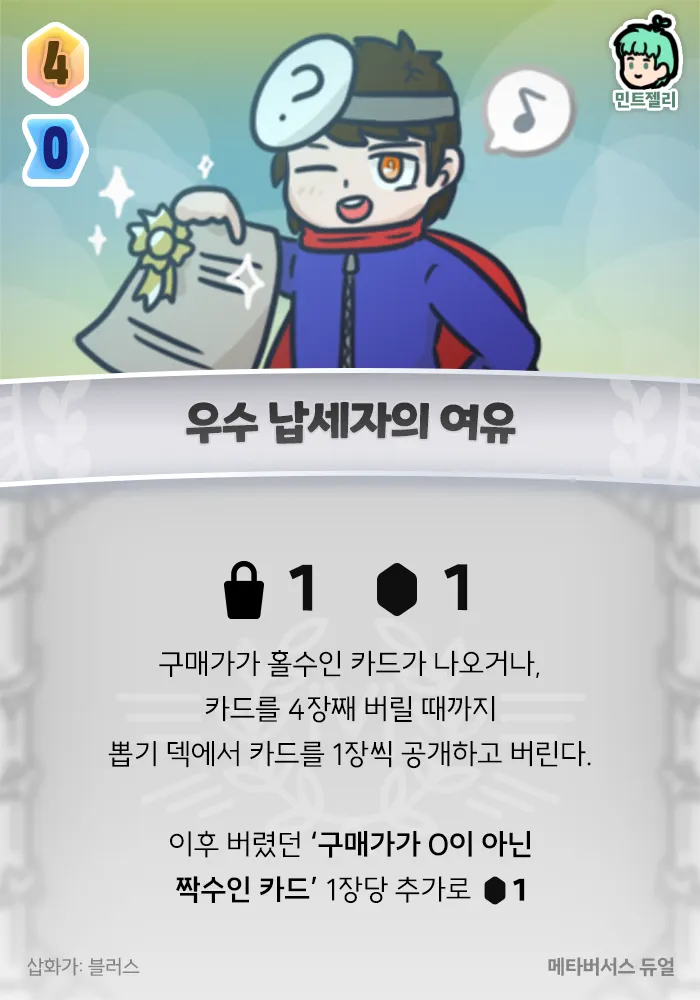 +1 구매, +1 젬, 구매가가 홀수인 카드가 나오거나, 카드를 4장째 버릴 때까지 뽑기 덱에서 카드를 1장씩 공개하고 버린다. 이후 버렸던 ‘구매가가 0이 아닌 짝수인 카드’ 1장당 +1 젬 (최대 +4 젬)