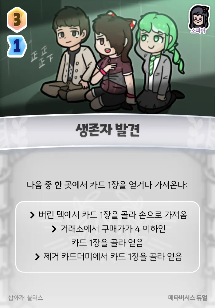 다음 중 한 곳에서 카드 1장을 얻거나 가져온다: ■ 버린 덱에서 구매가가 3 이하인 카드 1장을 골라 손으로 가져옴 ■ 거래소에서 구매가가 4 이하인 카드 1장을 골라 얻음 ■ 제거 카드더미에서 카드 1장을 골라 얻음