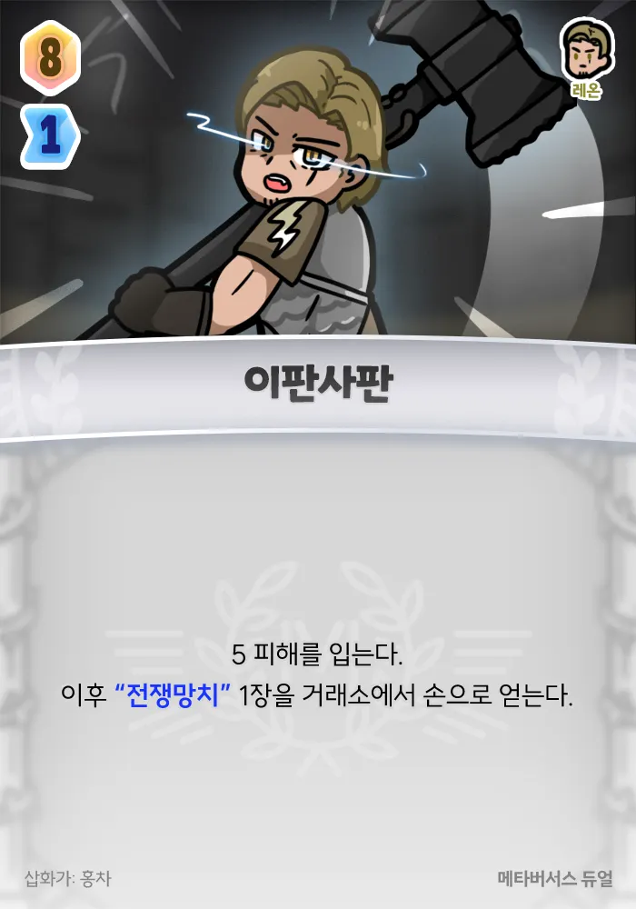 5 피해를 입는다. 이후 “전쟁망치” 1장을 거래소에서 손으로 얻는다.