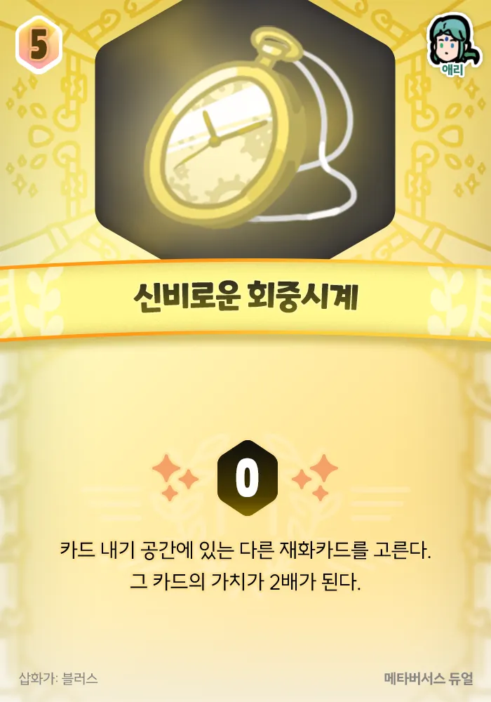 0 젬 가치, 카드 내기 공간에 있는 다른 재화카드를 고른다. 그 카드의 가치가 2배가 된다.