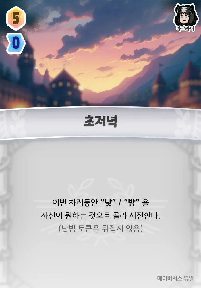 이번 차례동안 “낮” / “밤” 을 자신이 원하는 것으로 골라 시전한다. (낮밤 토큰은 뒤집지 않음)
