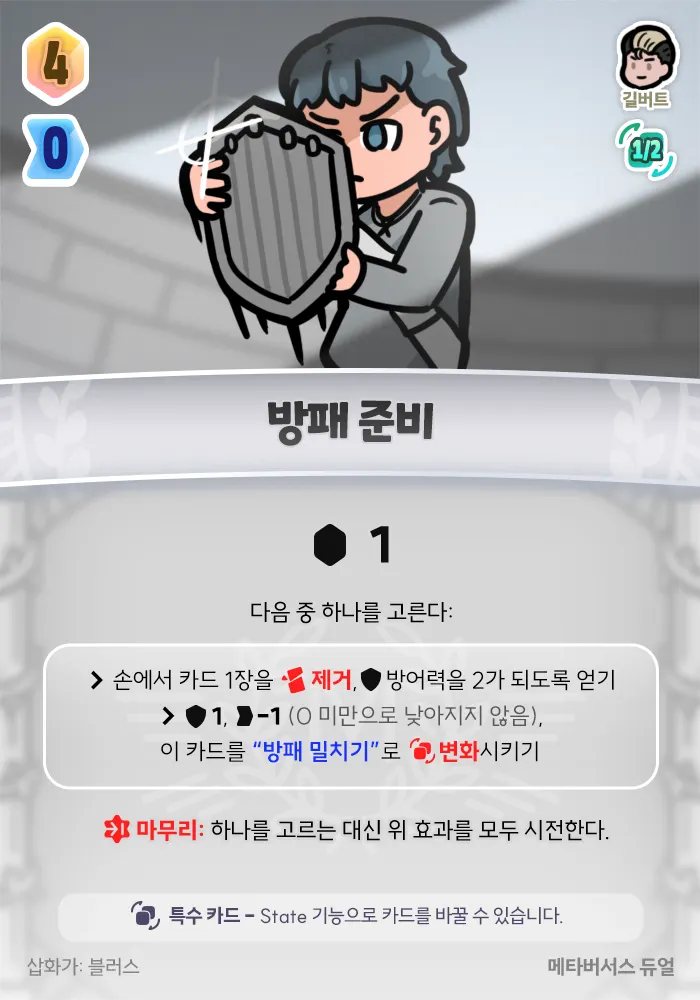 , 방어력을 2가 되도록 얻기 ■ +1 방어력, -1 행동력(0 미만으로 낮아지지 않음), 이 카드를 “방패 밀치기”로