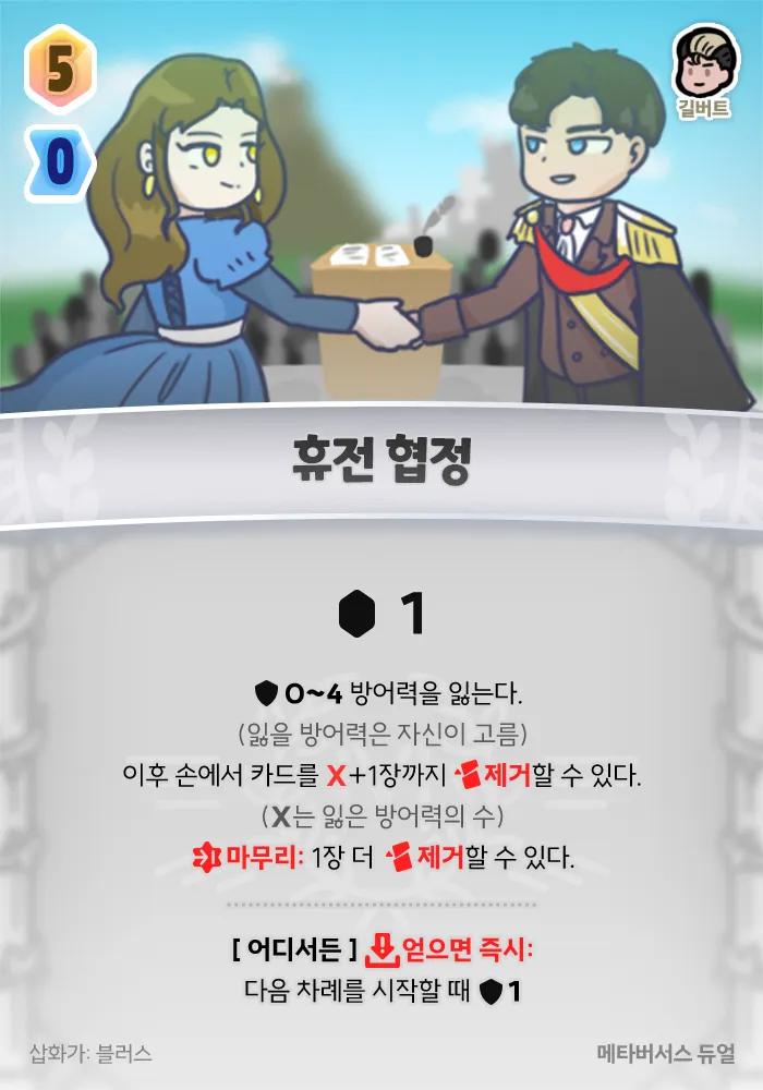 +1 젬, 0~4 방어력을 잃는다. (잃을 방어력은 자신이 고름) 이후 손에서 카드를