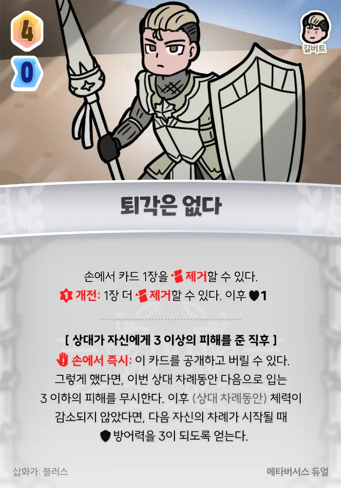 이 카드를 공개하고 버릴 수 있다. 그렇게 했다면, 이번 상대 차례동안 다음으로 입는 3 이하의 피해를 무시한다. 이후 (상대 차례동안) 체력이 감소되지 않았다면, 다음 자신의 차례가 시작될 때 방어력을 3이 되도록 얻는다.