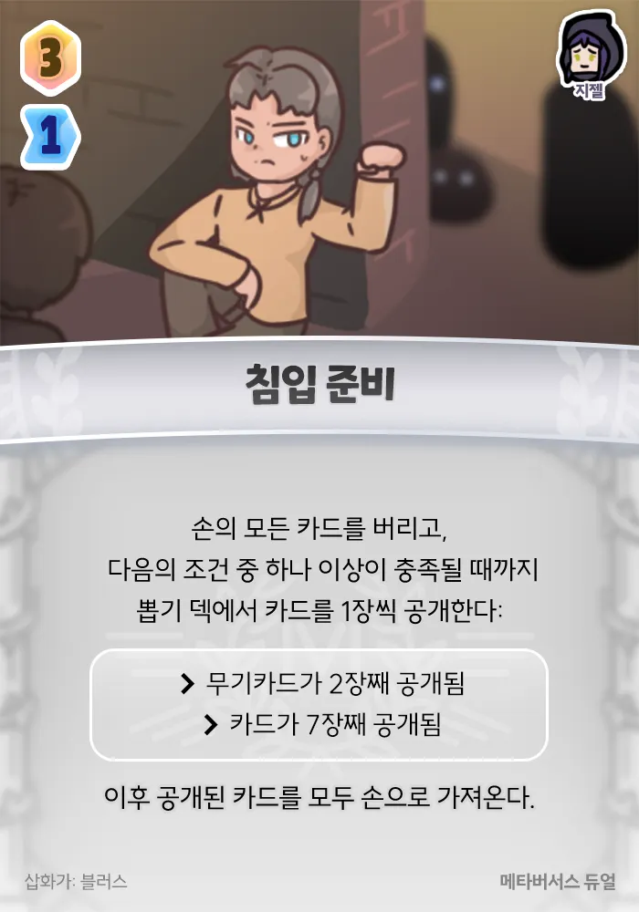 손의 모든 카드를 버리고, 다음의 조건 중 하나 이상이 충족될 때까지 뽑기 덱에서 카드를 1장씩 공개한다: ■ 무기카드가 2장째 공개됨 ■ 카드가 7장째 공개됨 이후 공개된 카드를 모두 손으로 가져온다.