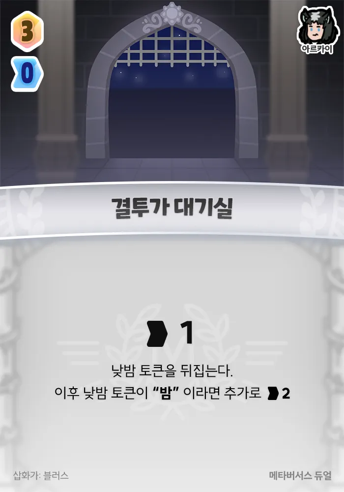 +1 행동력, 낮밤 토큰을 뒤집는다. 이후 낮밤 토큰이 “밤” 이라면 추가로 +2 행동력