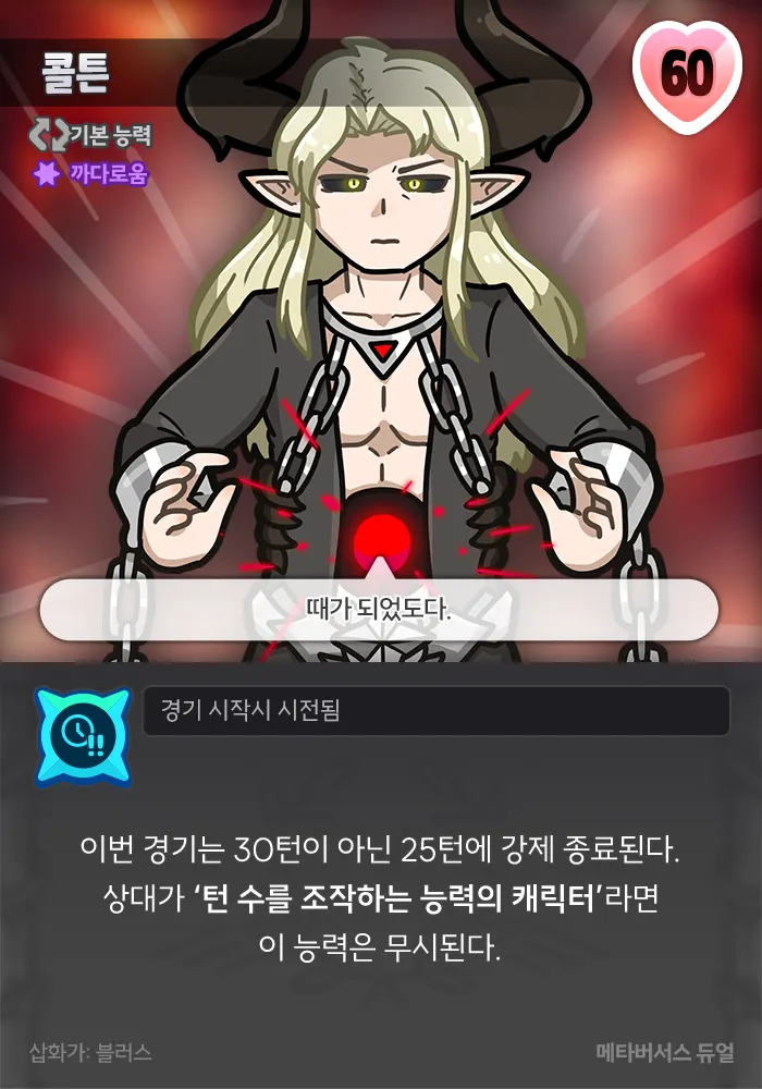 이번 경기는 30턴이 아닌 25턴에 종료된다. 상대가 ‘턴 수를 조작하는 능력의 캐릭터’라면 이 능력은 무시된다.