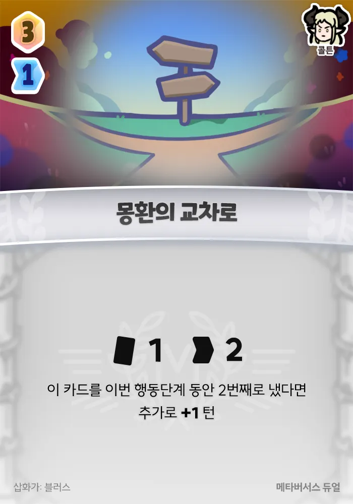 +1 카드, +2 행동력, 이 카드를 이번 행동단계 동안 2번째로 냈다면 추가로 +1 턴