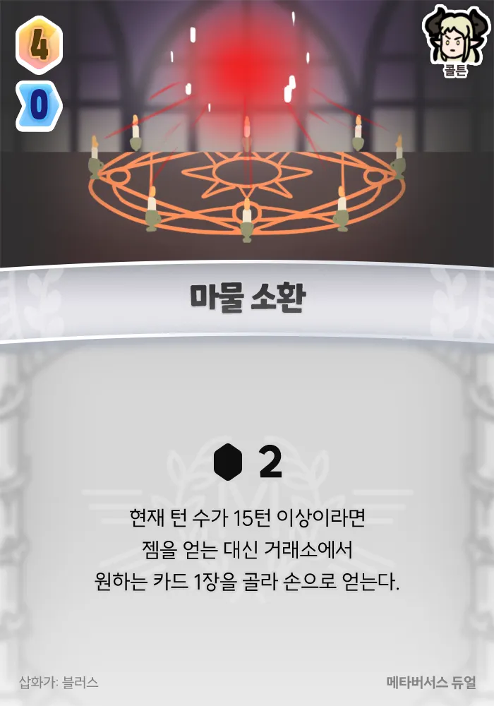 +2 젬, 현재 턴 수가 15턴 이상이라면 젬을 얻는 대신 거래소에서 원하는 카드 1장을 골라 손으로 얻는다.