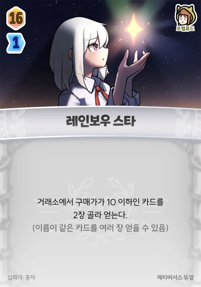 거래소에서 구매가가 10 이하인 카드를 2장 골라 얻는다. (이름이 같은 카드를 여러 장 얻을 수 있음)