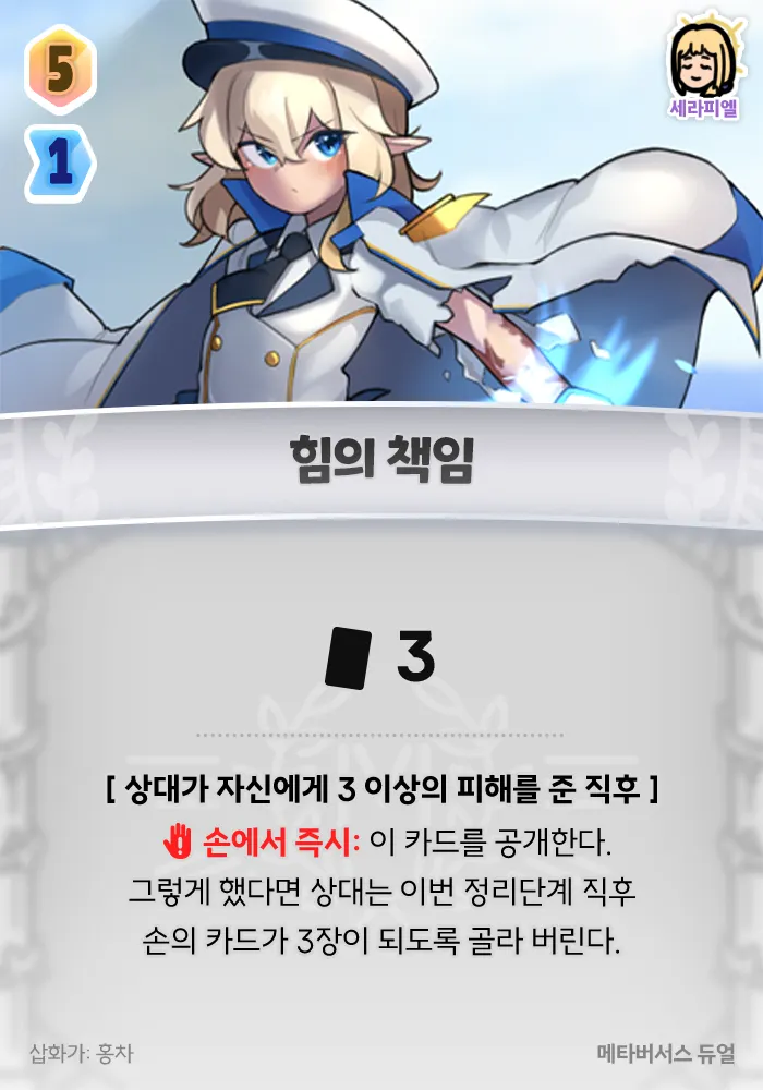 : 이 카드를 공개한다. 그렇게 했다면 상대는 이번 정리단계 직후 손의 카드가 3장이 되도록 골라 버린다.