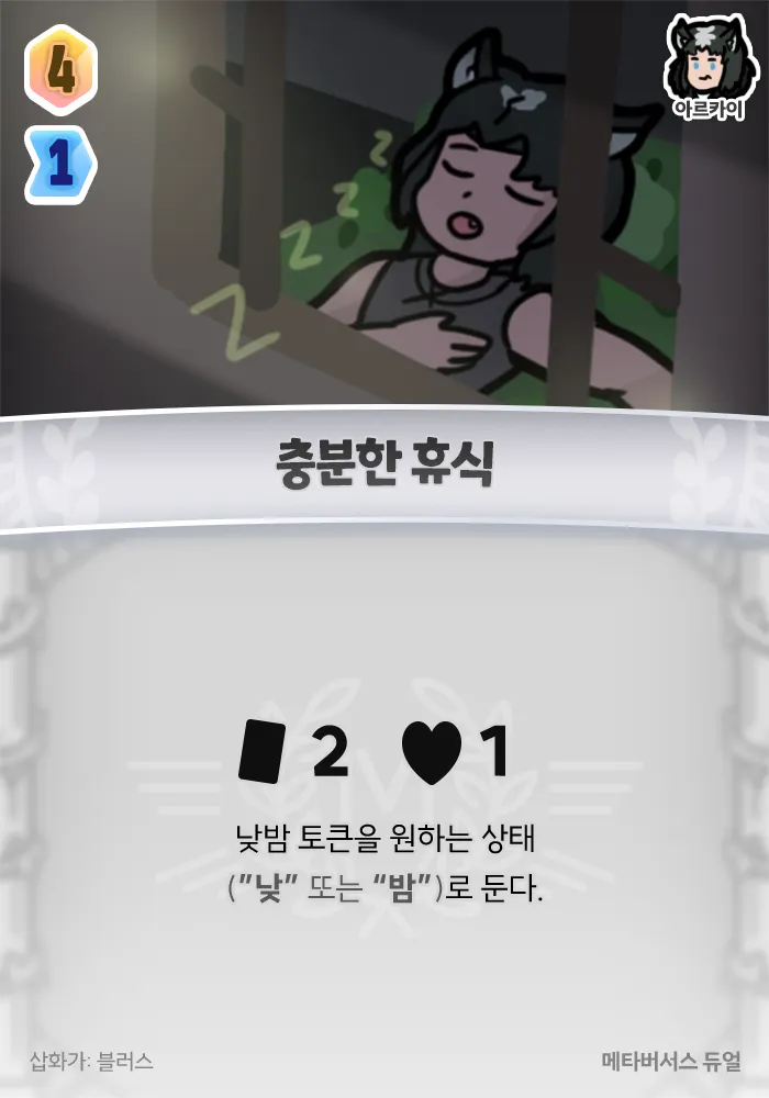 +2 카드, +1 체력, 낮밤 토큰을 원하는 상태 (”낮” 또는 “밤”)로 둔다.