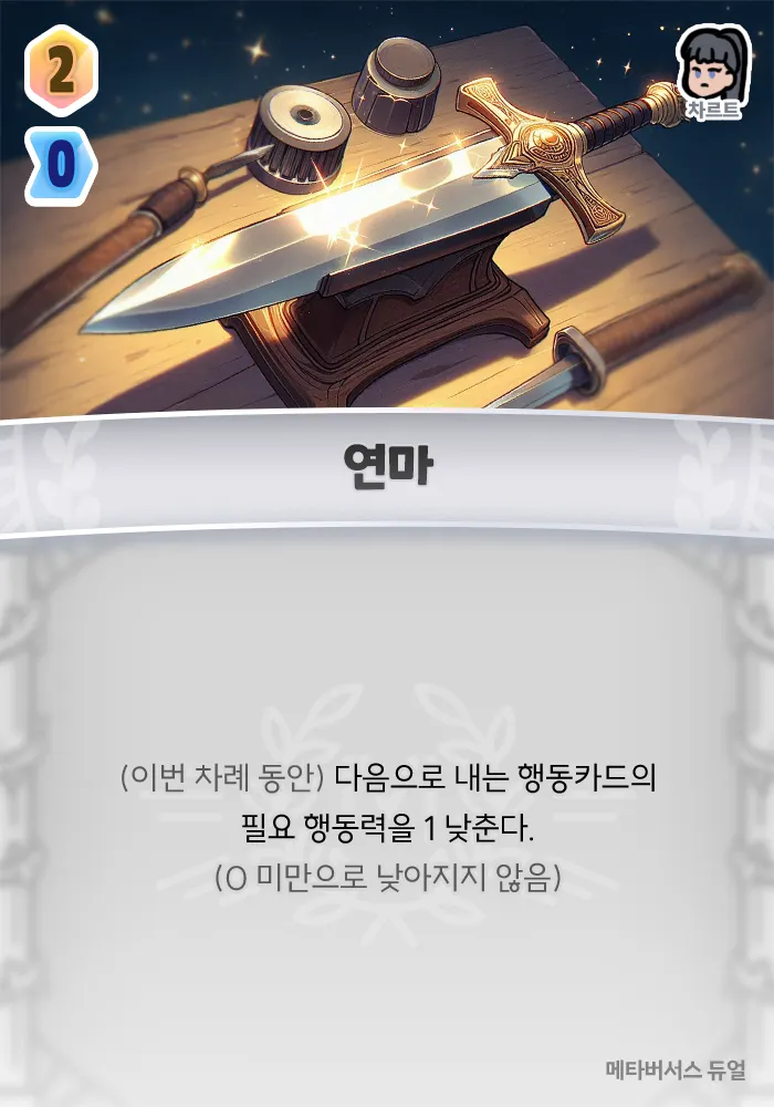 (이번 차례동안) 다음으로 내는 행동카드의 필요 행동력을 1 낮춘다. (0 미만으로 낮아지지 않음)