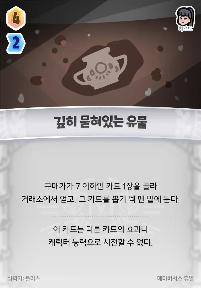 구매가가 7 이하인 카드 1장을 골라 거래소에서 얻고, 그 카드를 뽑기 덱 맨 밑에 둔다. 이 카드는 다른 카드의 효과나 캐릭터 능력으로 시전할 수 없다.