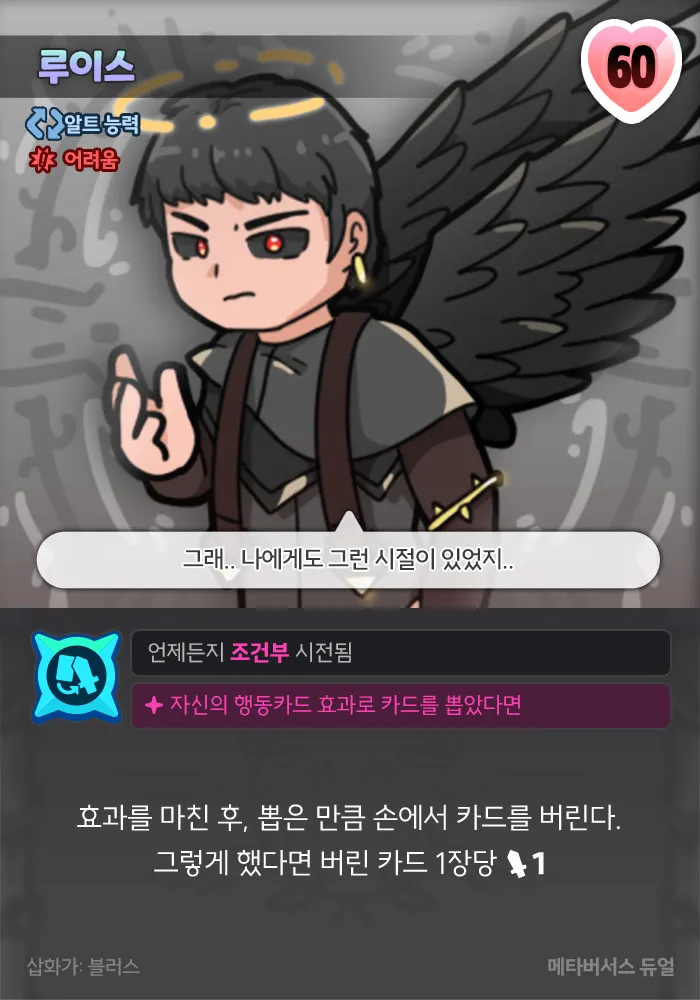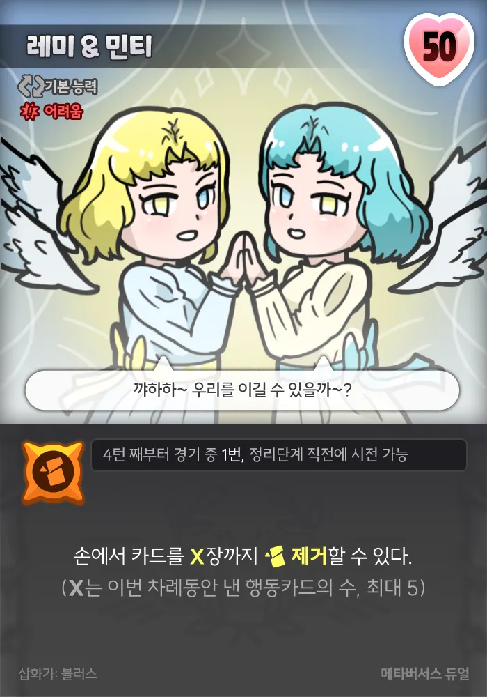 ■ 뽑기 덱에서 카드 1장을 공개하고 버린다. 버린 카드가 행동카드라면 그 카드의 효과를 시전한다.