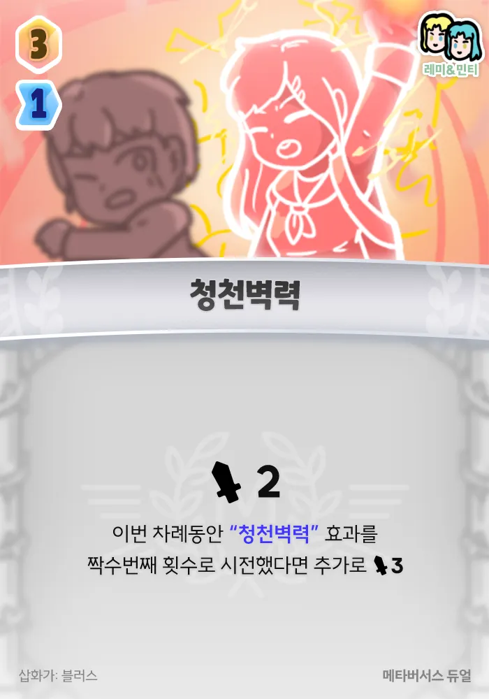 2 피해, 이번 차례동안 “청천벽력” 효과를 짝수번째 횟수로 시전했다면 추가로 3 피해.