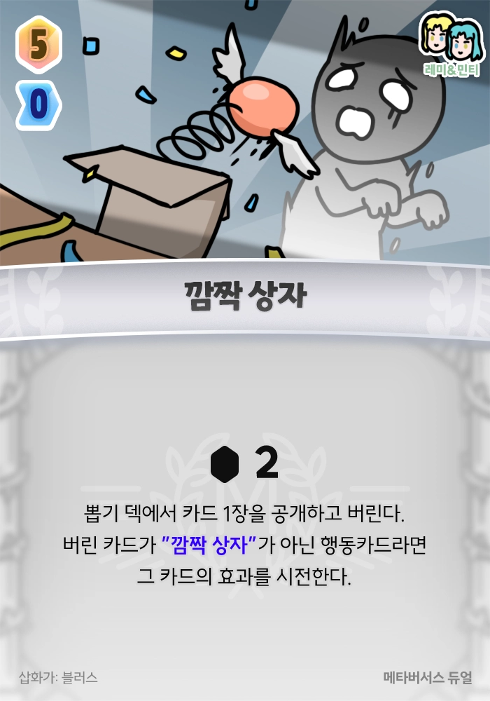 +2 젬, 뽑기 덱에서 카드 1장을 공개하고 버린다. 버린 카드가 “깜짝 상자”가 아닌 행동카드라면 그 카드의 효과를 시전한다.