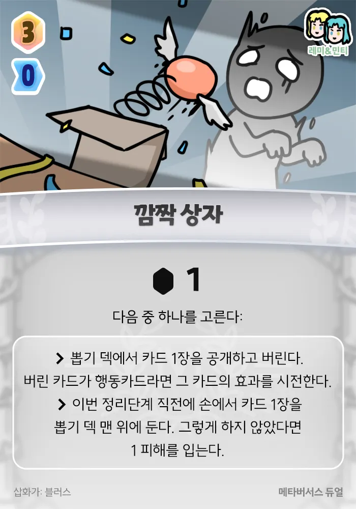 +1 젬, 다음 중 하나를 고른다: ■ 뽑기 덱에서 카드 1장을 공개하고 버린다. 버린 카드가 행동카드라면 그 카드의 효과를 시전한다. ■ 이번 정리단계 직전에 손에서 카드 1장을 뽑기 덱 맨 위에 둔다. 그렇게 하지 않았다면 1 피해를 입는다.