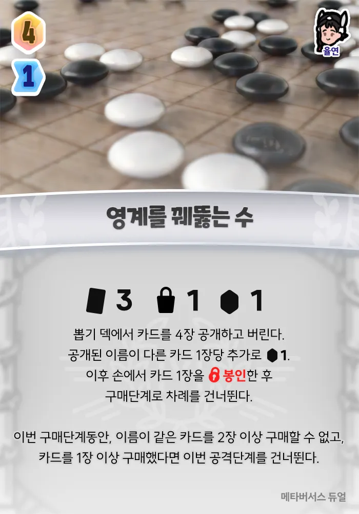 한 후 구매단계로 차례를 건너뛴다. 이번 구매단계동안, 이름이 같은 카드를 2장 이상 구매할 수 없고, 카드를 1장 이상 구매했다면 이번 공격단계를 건너뛴다.