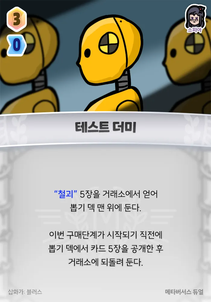 “철괴” 5장을 거래소에서 얻어 뽑기 덱 맨 위에 둔다. 이번 구매단계가 시작되기 직전에 뽑기 덱에서 카드 5장을 공개한 후 거래소에 되돌려 둔다.