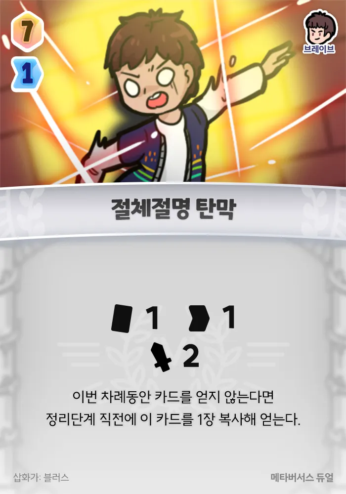 +1 카드, +1 행동력, 2 피해 이번 차례동안 카드를 얻지 않는다면 정리단계 직전에 이 카드를 1장 복사해 얻는다.