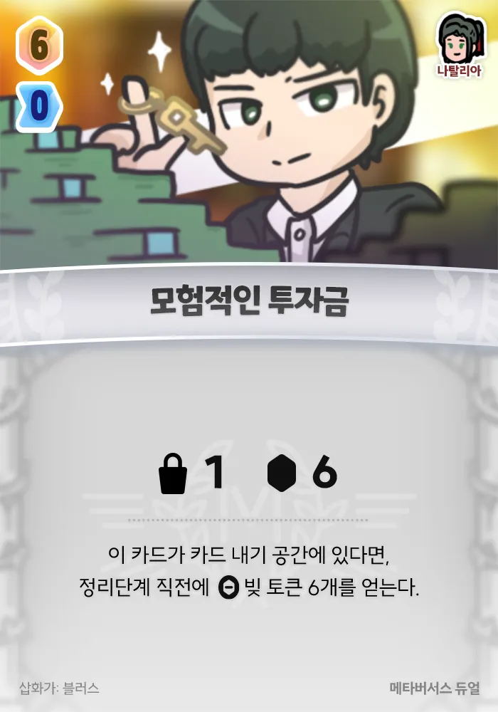 +1 구매, +6 젬. 이 카드가 카드 내기 공간에 있다면, 정리단계 직전에 빚 토큰 6개를 얻는다.