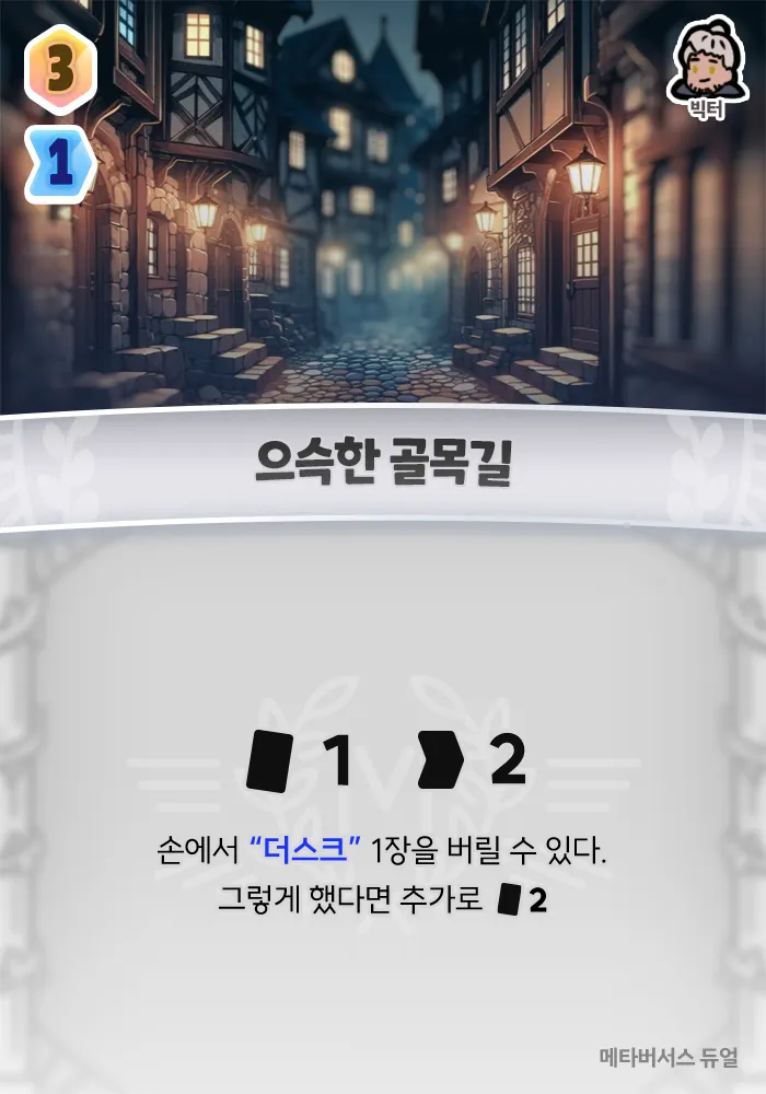 +1 카드, +2 행동력, 손에서 “더스크” 1장을 버릴 수 있다. 그렇게 했다면 추가로 +2 카드