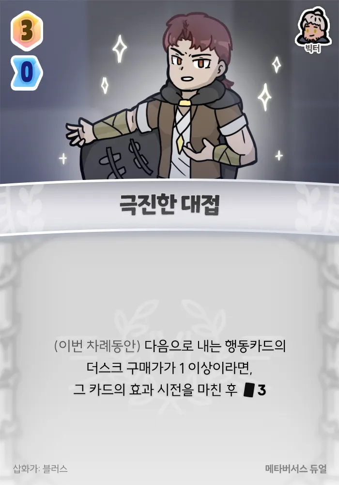 (이번 차례동안) 다음으로 내는 행동카드의 더스크 구매가가 1 이상이라면, 그 카드의 효과 시전을 마친 후 +3 카드