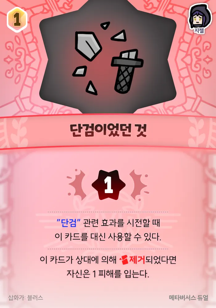 1 피해량. ”단검” 관련 효과를 시전할 때 이 카드를 대신 사용할 수 있다. 이 카드가 상대에 의해