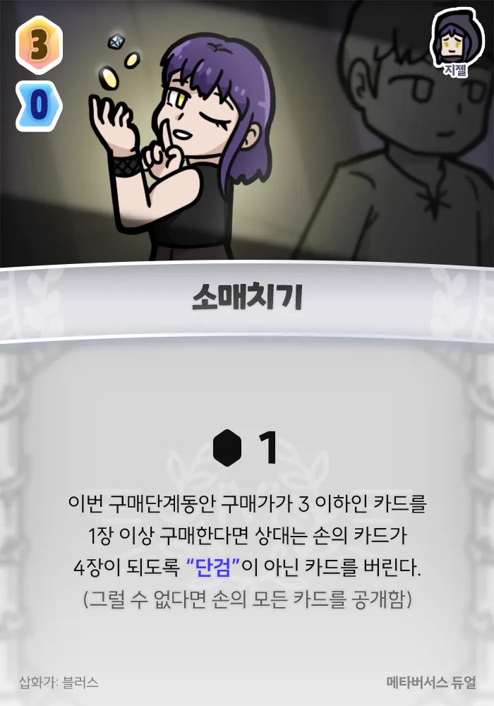 +1 젬, 이번 구매단계동안 구매가가 3 이하인 카드를 1장 이상 구매한다면 상대는 손의 카드가 4장이 되도록 “단검”이 아닌 카드를 버린다. (그럴 수 없다면 손의 모든 카드를 공개함)