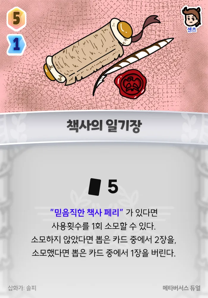 +5 카드, ”믿음직한 책사 페리” 가 있다면 사용횟수를 1회 소모할 수 있다. 소모하지 않았다면 뽑은 카드 중에서 2장을, 소모했다면 뽑은 카드 중에서 1장을 버린다.