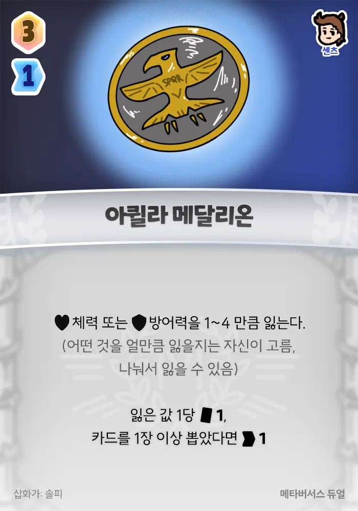 체력 또는 방어력을 1~4 만큼 잃는다. (어떤 것을 얼만큼 잃을지는 자신이 고름, 나눠서 잃을 수 있음) 잃은 값 1당 +1 카드, 카드를 1장 이상 뽑았다면 +1 행동력.