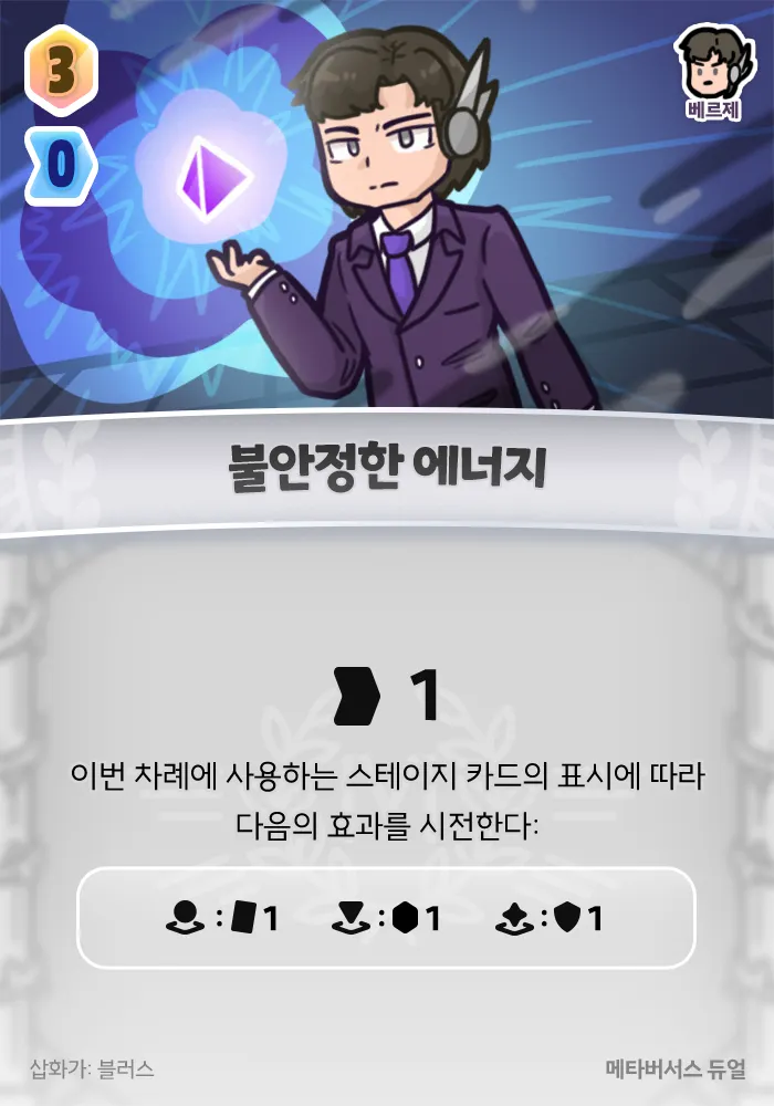+1 행동력, 이번 차례에 사용하는 스테이지 카드의 표시에 따라 다음의 효과를 시전한다: ○: +1 카드 ▲: +1 젬 ◆: +1 방어력