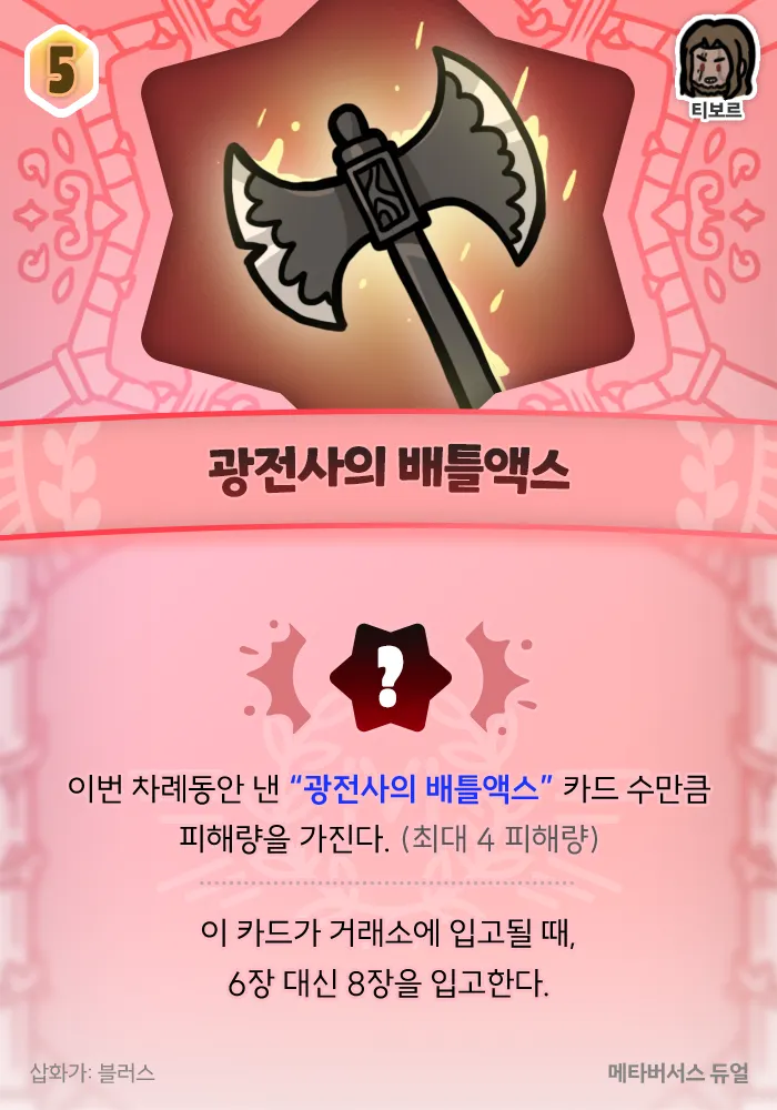 는 이번 차례동안 낸 “광전사의 배틀액스” 카드 수, 최대 4) 이 카드가 거래소에 입고될 때, 6장 대신 8장을 입고한다.