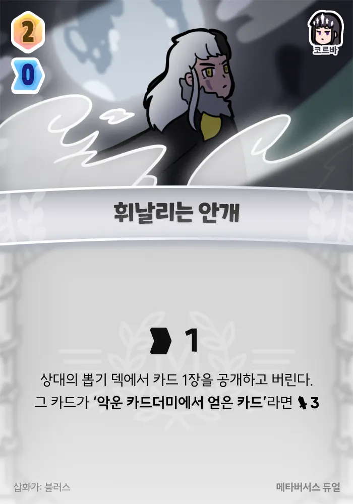 +1 행동력, 상대의 뽑기 덱에서 카드 1장을 공개하고 버린다. 그 카드가 ‘악운 카드더미에서 얻은 카드’라면 3 피해.