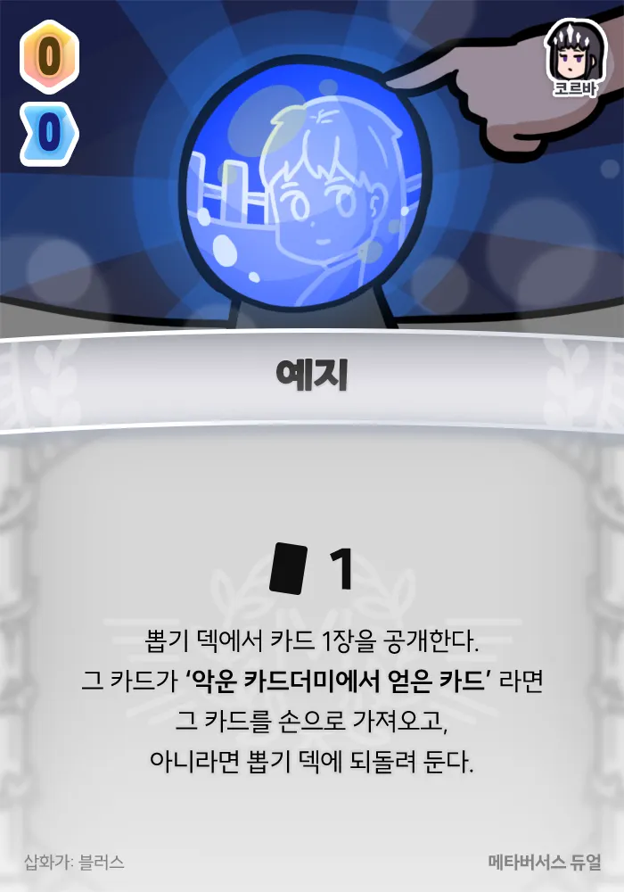 +1 카드, 뽑기 덱에서 카드 1장을 공개한다. 그 카드가 ‘악운 카드더미에서 얻은 카드’ 라면 그 카드를 손으로 가져오고, 아니라면 뽑기 덱에 되돌려 둔다.
