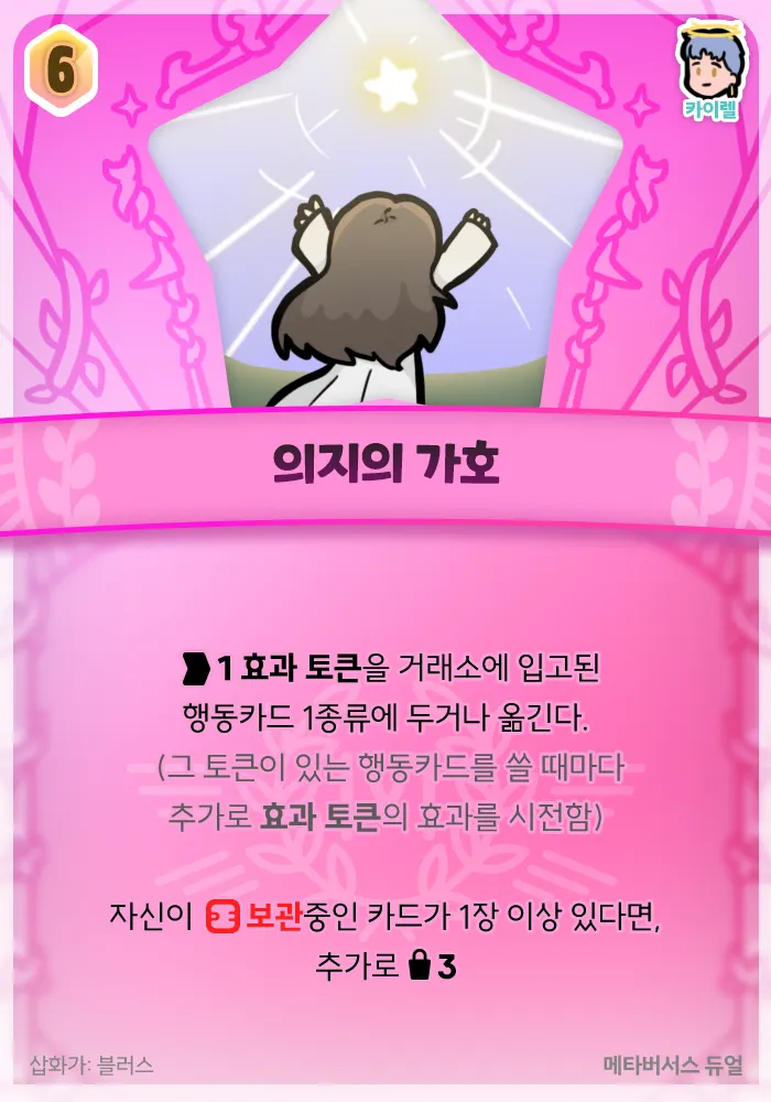 “[+1 행동력] 효과 토큰” 을 거래소에 입고된 행동카드 1종류에 두거나 옮긴다. (그 토큰이 있는 행동카드를 쓸 때마다 추가로 효과 토큰의 효과를 시전함) 자신이