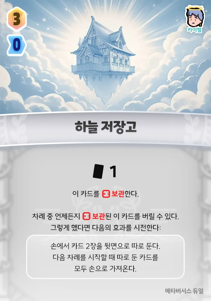 된 이 카드를 버릴 수 있다. 그렇게 했다면 다음의 효과를 시전한다: [ 손에서 카드 2장을 뒷면으로 따로 둔다. 다음 차례를 시작할 때 따로 둔 카드를 모두 손으로 가져온다. ]