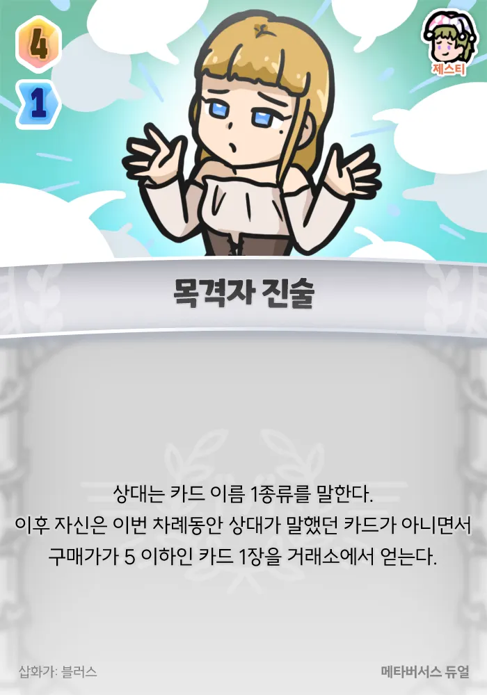 상대는 카드 이름 1종류를 말한다. 이후 자신은 이번 차례동안 상대가 말했던 카드가 아니면서