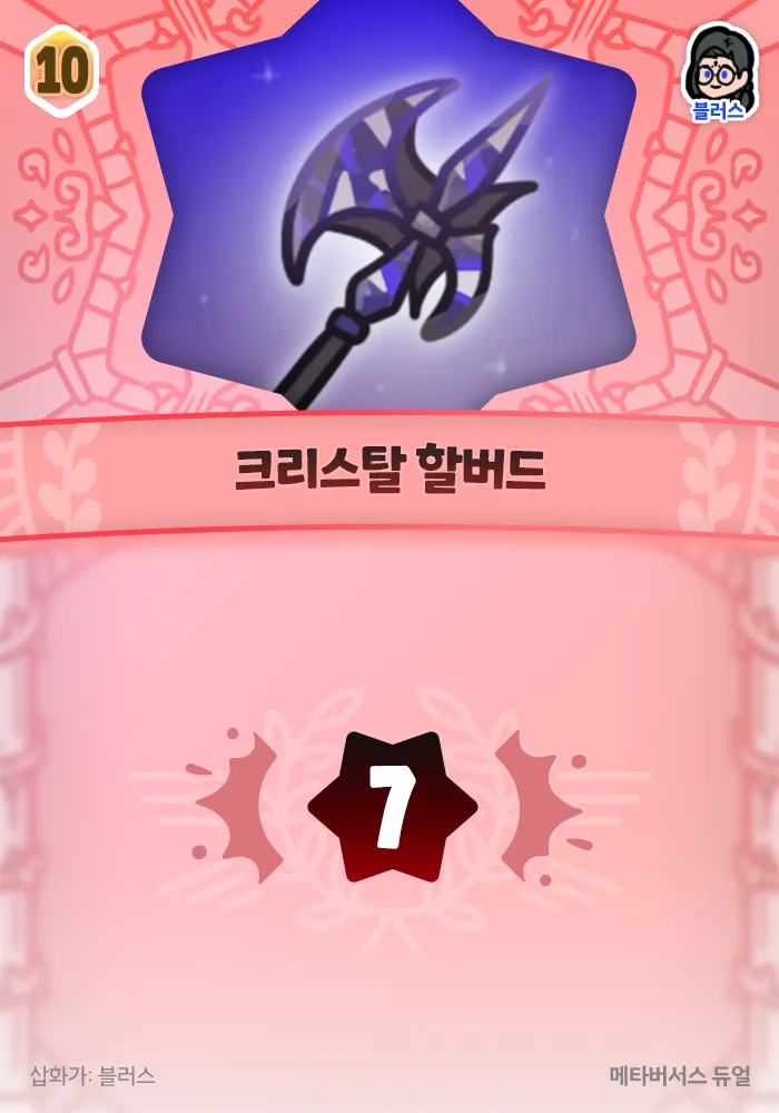 크리스탈 할버드 가 5장이 손에 잡히므로 매 차례마다 35 피해를 주게 됩니다!! 어렵고 이론에 가까운 전략이지만, 상대를 깜짝 놀래킬 수 있는 방법이므로 도전해보세요!