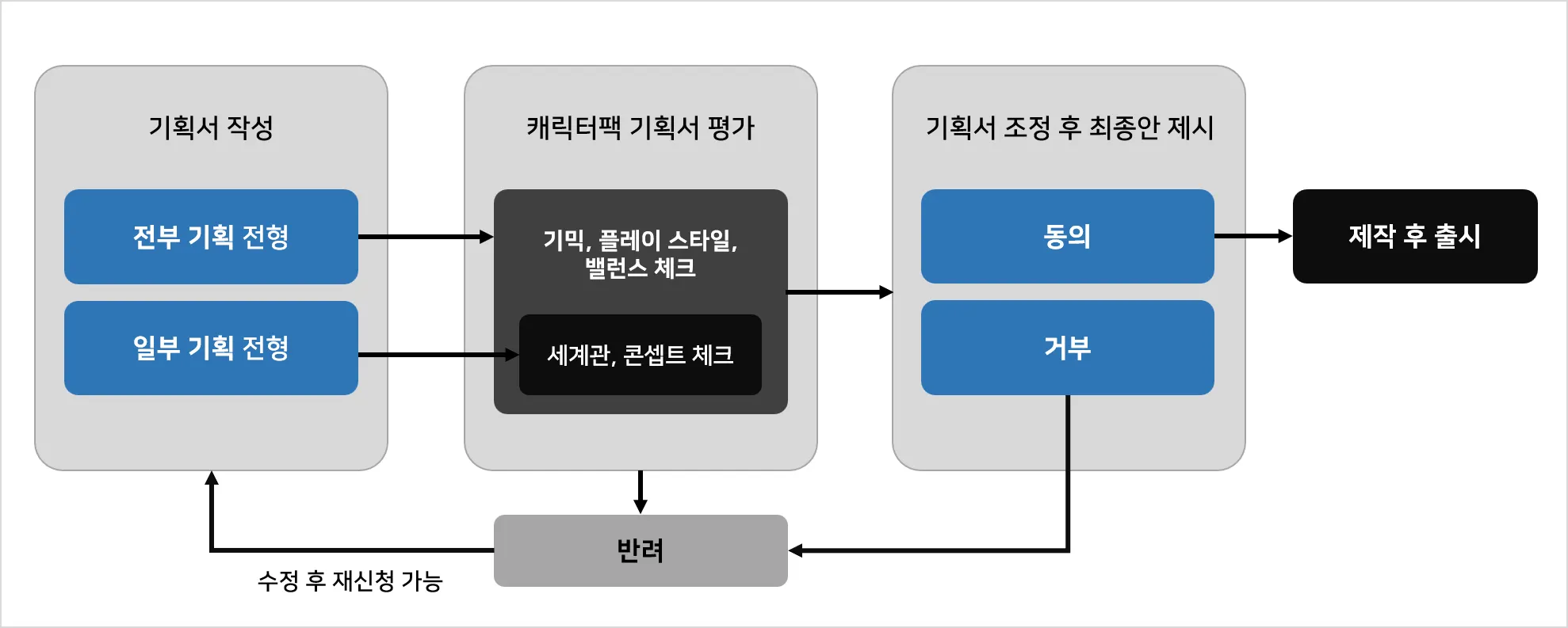 작성하신 기획서를 평가한 후, 밸런스/추가 규칙 등이 조정된 최종안이 신청자에게 제시됩니다. (또는 즉시 반려될 수도 있습니다.) 최종안이 제시된 경우엔 신청자는 내용을 확인 한 후 동의 또는 거부를 선택할 수 있습니다. 거부 선택시 최종적으로 반려되며, 동의시엔 일러스트 및 컴포넌트 작업을 진행해야합니다.