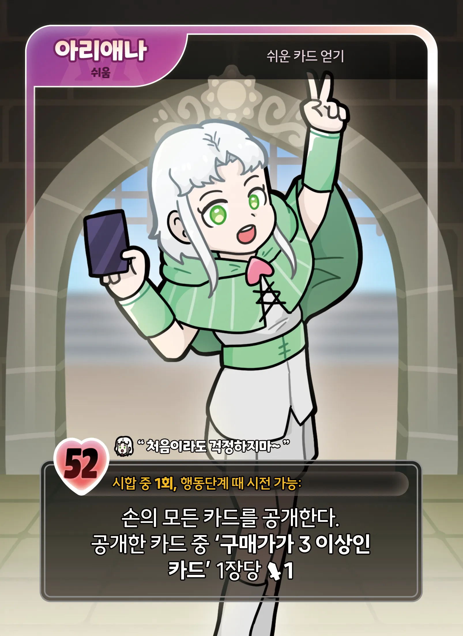 아리애나는 초심자를 대상으로 제작된 캐릭터팩입니다. 이 팩엔 간단한 효과의 카드들과 '카드를 쉽게 얻어올 수 있는 효과'의 카드들이 수록되어 있습니다. 다만 구매가가 비싸므로, 중요한 카드를 얻을 때까지 시간을 버는 것이 중요할 것입니다. 자유자재로 카드를 만들어 낼 수 있는 아리애나와 함께 시합을 쉽게 풀어나가 봅시다!